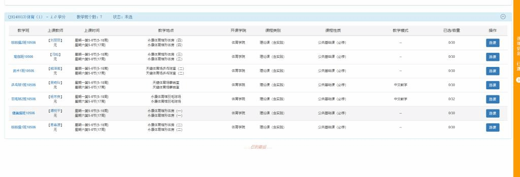 二、体育课选课在教务管理系统中进行,只需要一次选课操作,选上即为选中,体育项目教学班名额满后不再接收学生选课。如果学生没有在规定的时间内选课,将在选课结束后被随机安排到有空余名额的教学班。