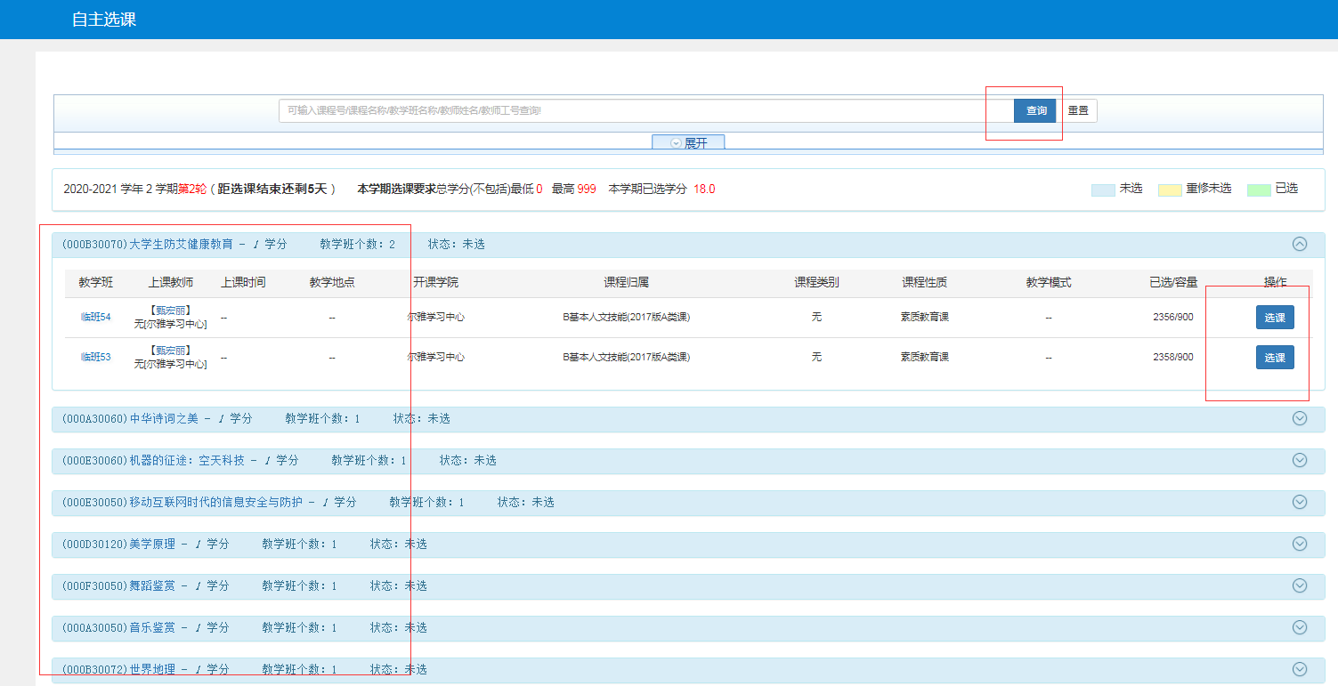 2.点击选课->自主选课进入文化素质教育选修课选课界面,在自主选课界面下点击查询,出现课程信息后,点击右侧选课按钮选课即可。见下图: